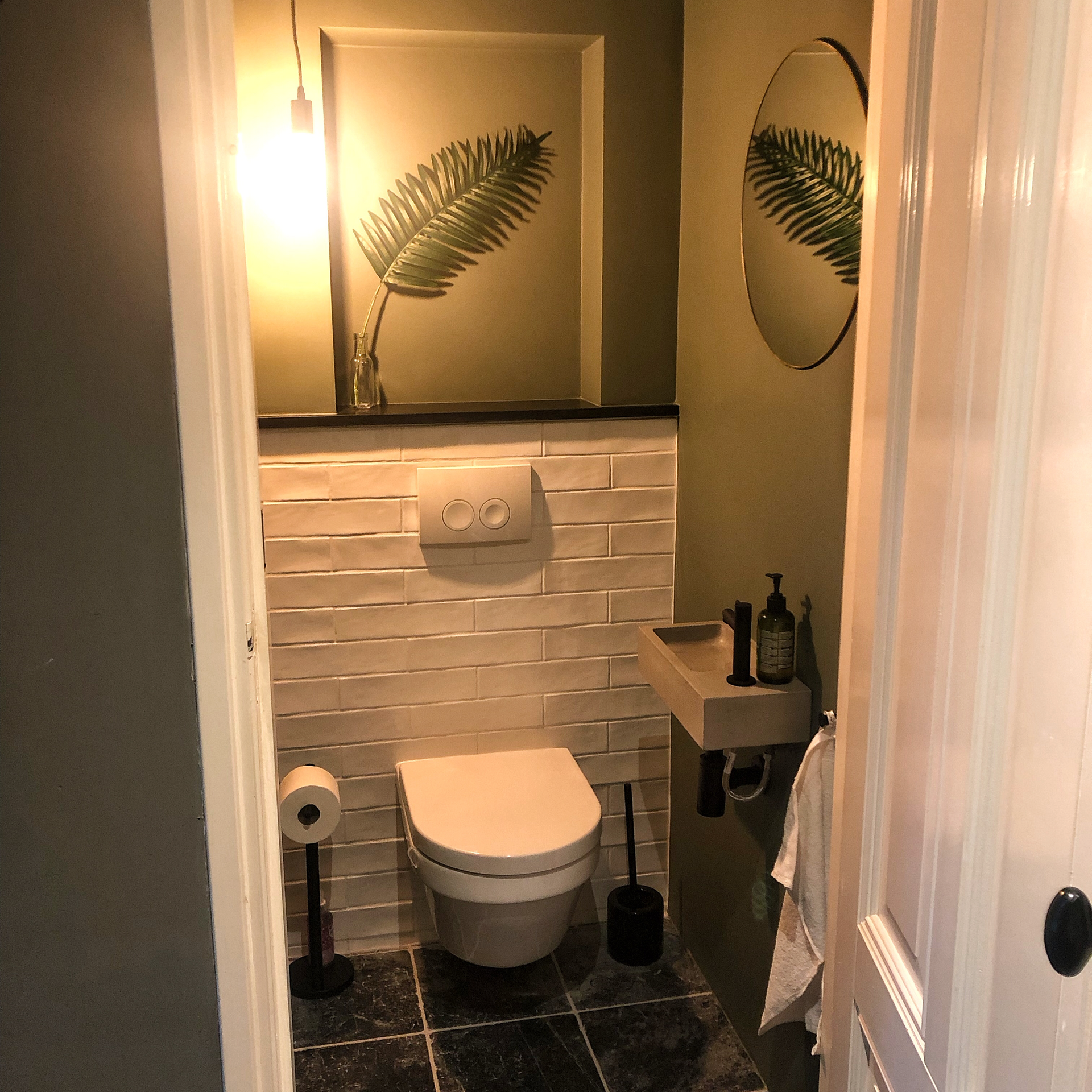Door naar de moderne badkamer, die in 2022 compleet is verbouwd. Deze heeft een bad (heerlijk na een lange boswandeling), een aparte douchcabine, een wastafel met twee kranen en een wc. Shampoo en douchegel staat voor jullie klaar.