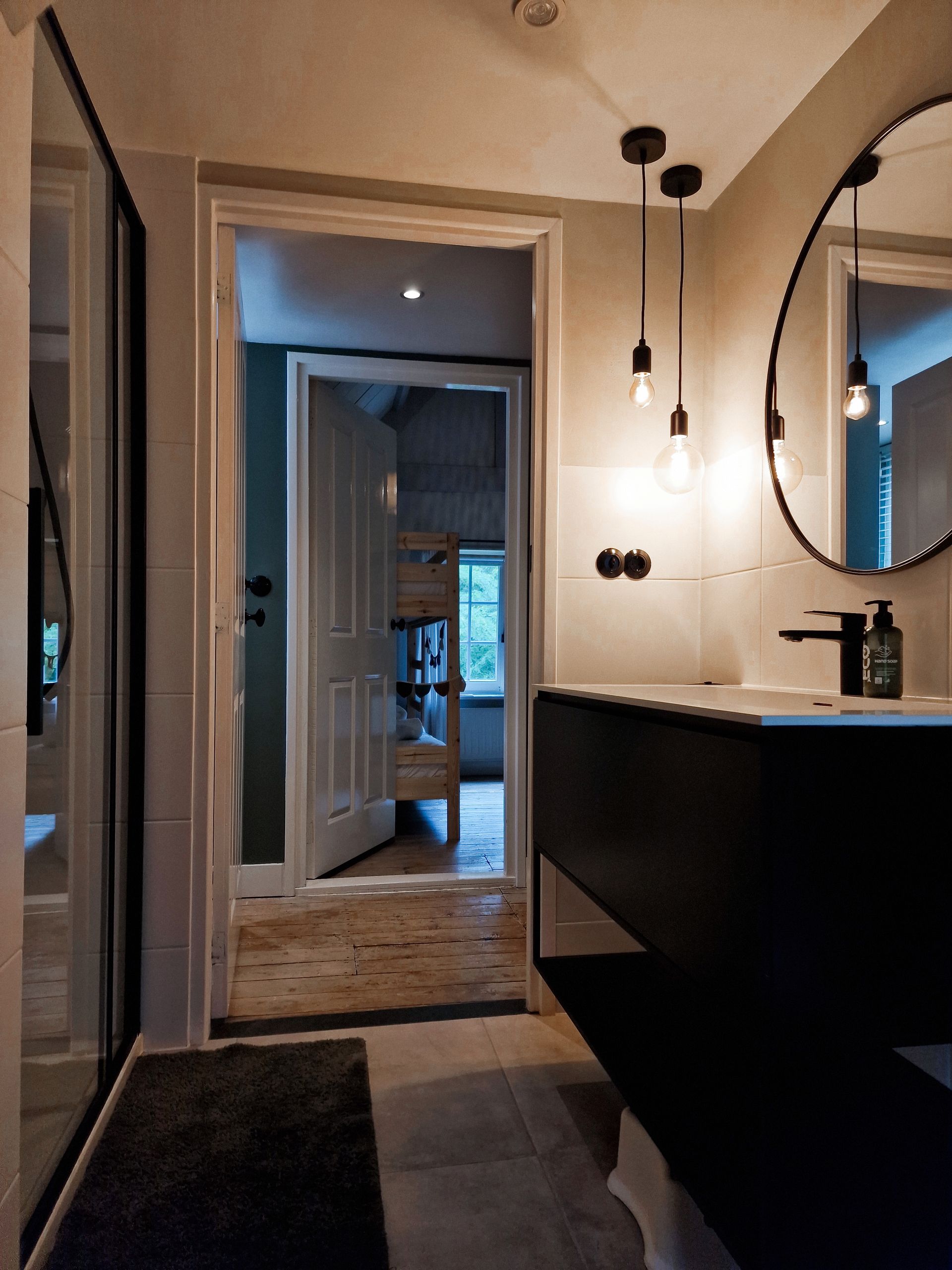 Door naar de moderne badkamer, die in 2022 compleet is verbouwd. Deze heeft een bad (heerlijk na een lange boswandeling), een aparte douchcabine, een wastafel met twee kranen en een wc. Shampoo en douchegel staat voor jullie klaar.