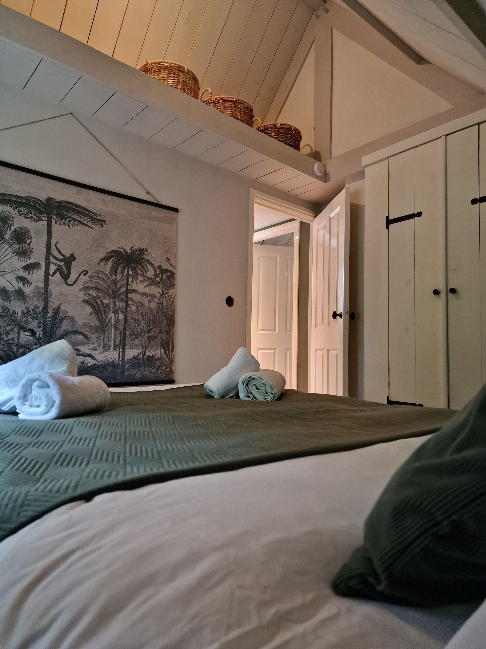 Het huis heeft 2 slaapkamers. In de master bedroom staat een tweepersoonsbed, hier past eventueel een campingbedje naast. Ook bevindt zich in deze kamer een vaste kast, in deze kast vind je het campingbedje voor de allerkleinsten. Ook staat hier een strijkijzer en strijkplank.
